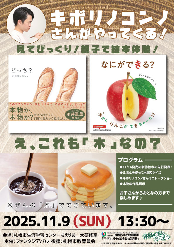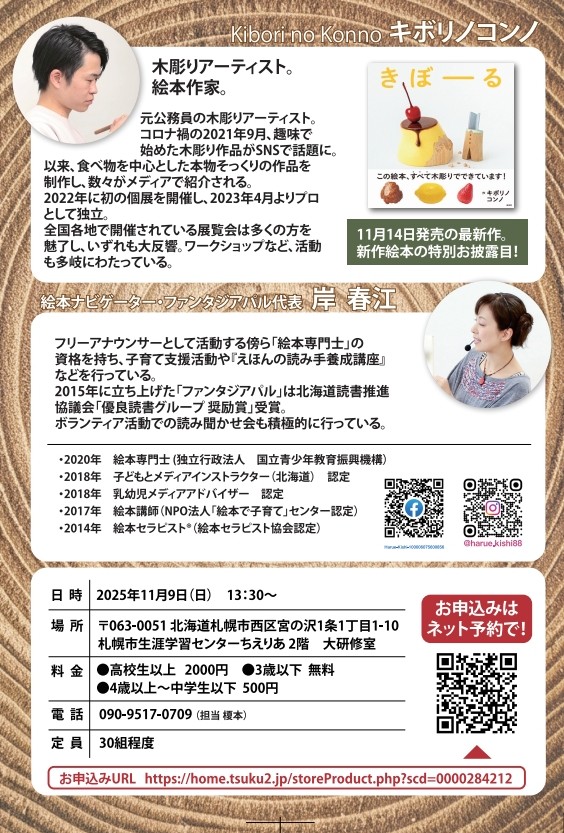 木彫りから生まれる温かい物語で人気の作家、キボリノコンノさんをお招きし、特別なイベントを開催いたします。